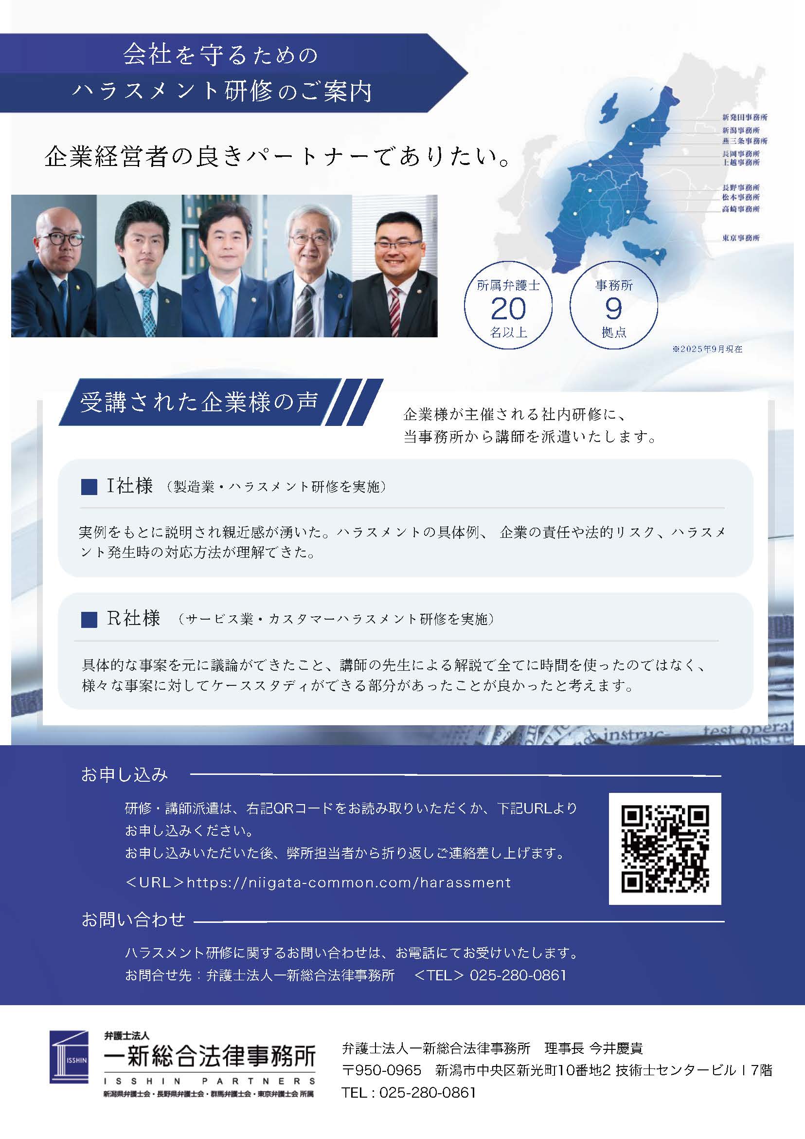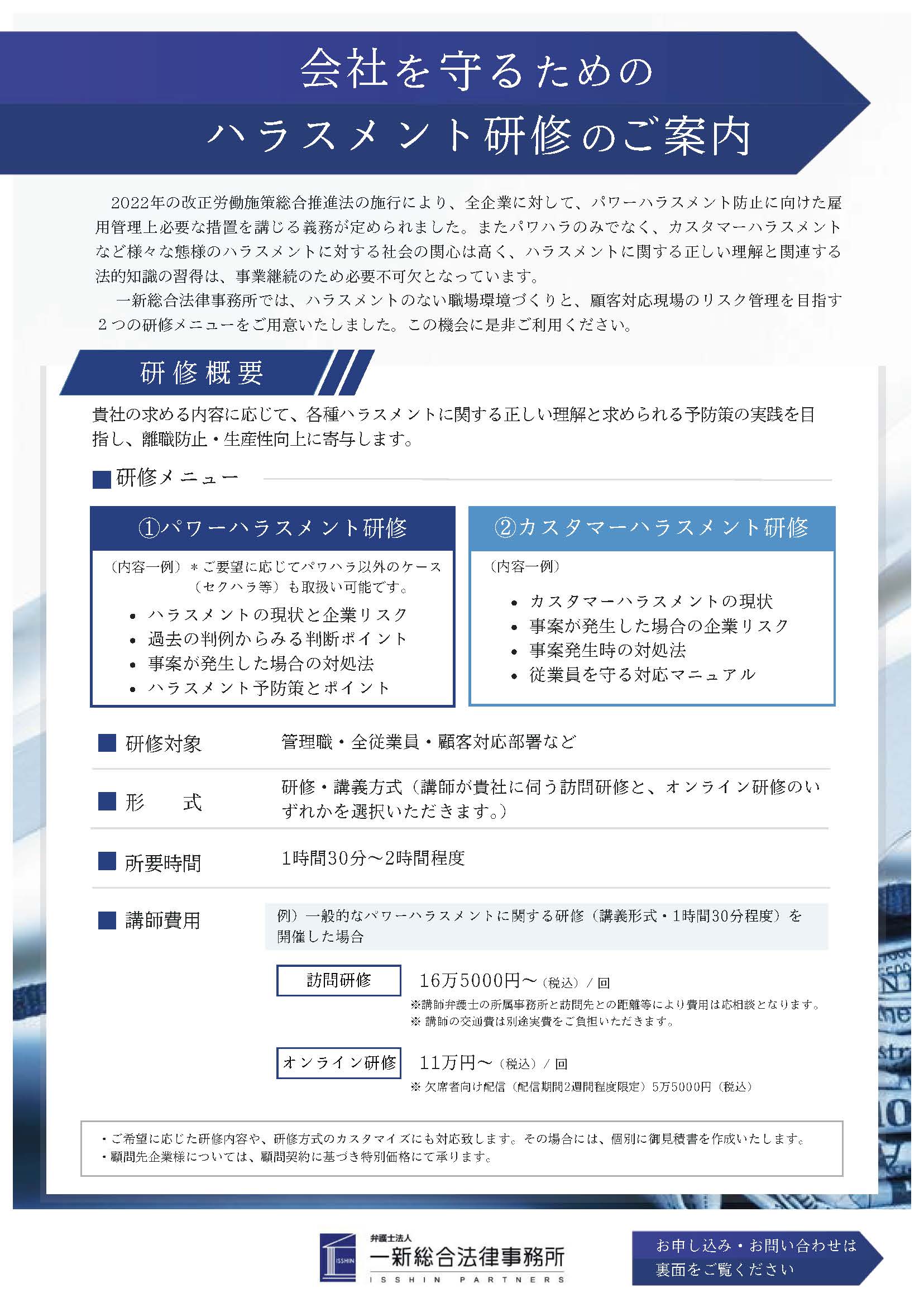 一新総合法律事務所では、弁護士によるハラスメント研修(管理職向け・全従業員向け)をご用意しております。